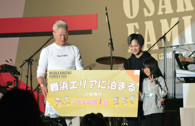 オープニングが終われば子供たちがステージ前に集まり、お待ちかね抽選会のスタートだ。誰もがうれしいミスタードーナツの3,000円カードや、スターバックスコーヒーの5,000円カード各50枚をはじめ、スマートウォッチ、ニンテンドースイッチ、デジタルカメラ、ドローンなど、子供だけでなく大人でも欲しくなる賞品を目当てに、ステージ両サイドのスクリーンに映し出される当選ナンバーを、興味津々の眼差しで見つめている。そして最後は白浜温泉に泊まる、沖縄エリアに泊まる、舞浜エリアに泊まるなどの旅行券だ。子供たちの溜息と歓声のうちに抽選会は終了した。